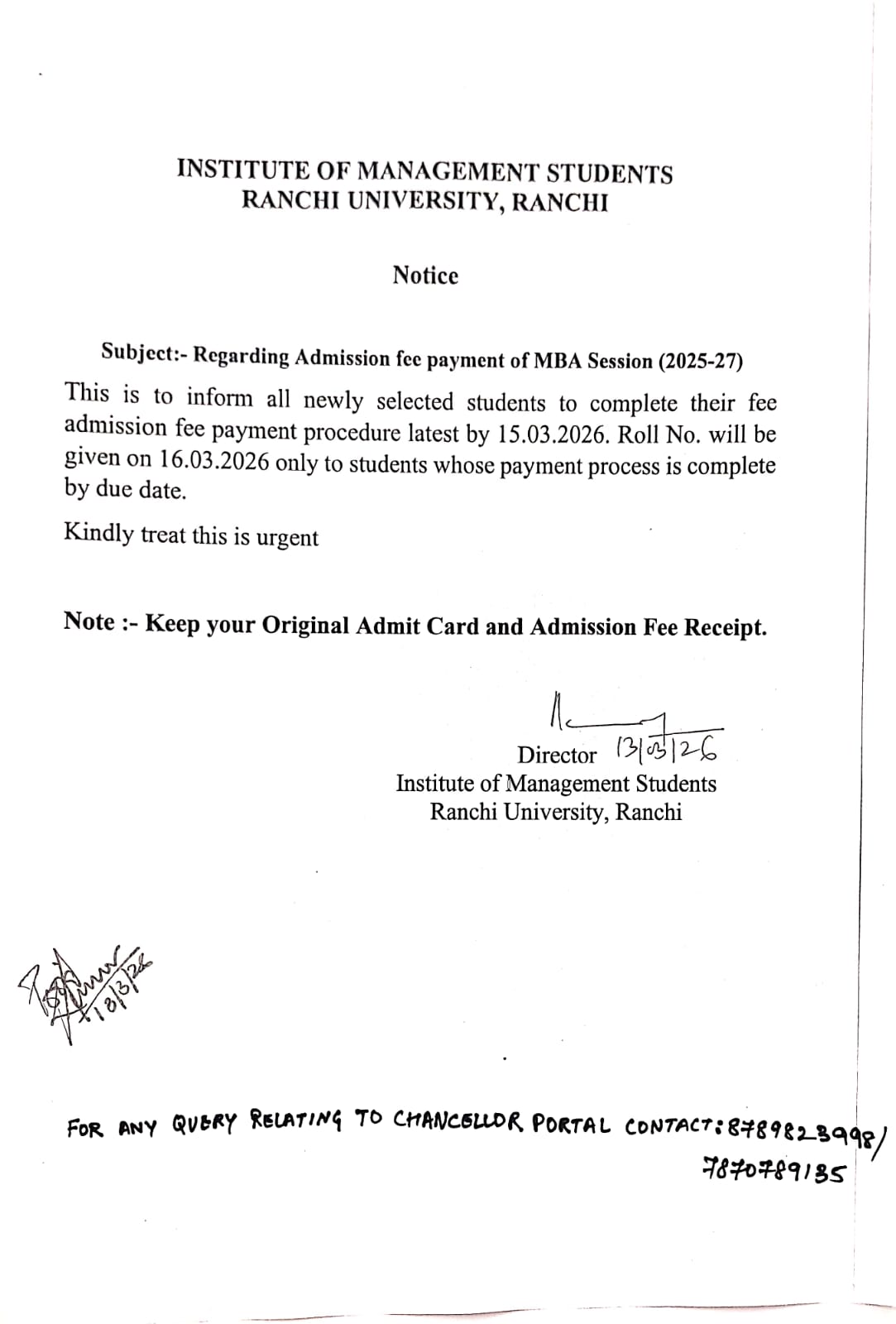 Notice Regarding Admission Fee Payment of MBA Session 2025-27